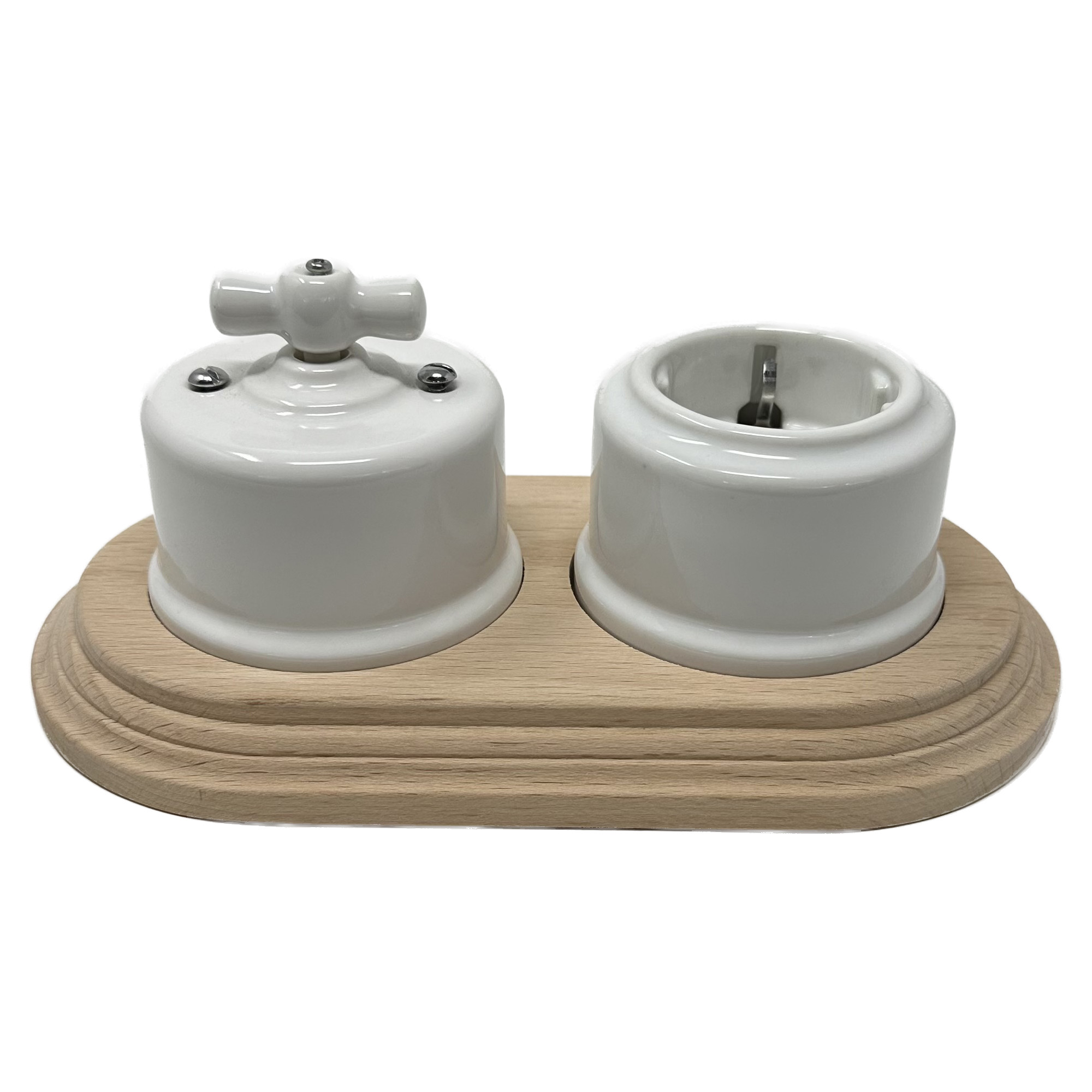 Base double en bois naturel pour interrupteurs/déviateurs et prises adaptée pour créer des installations électriques vintage.