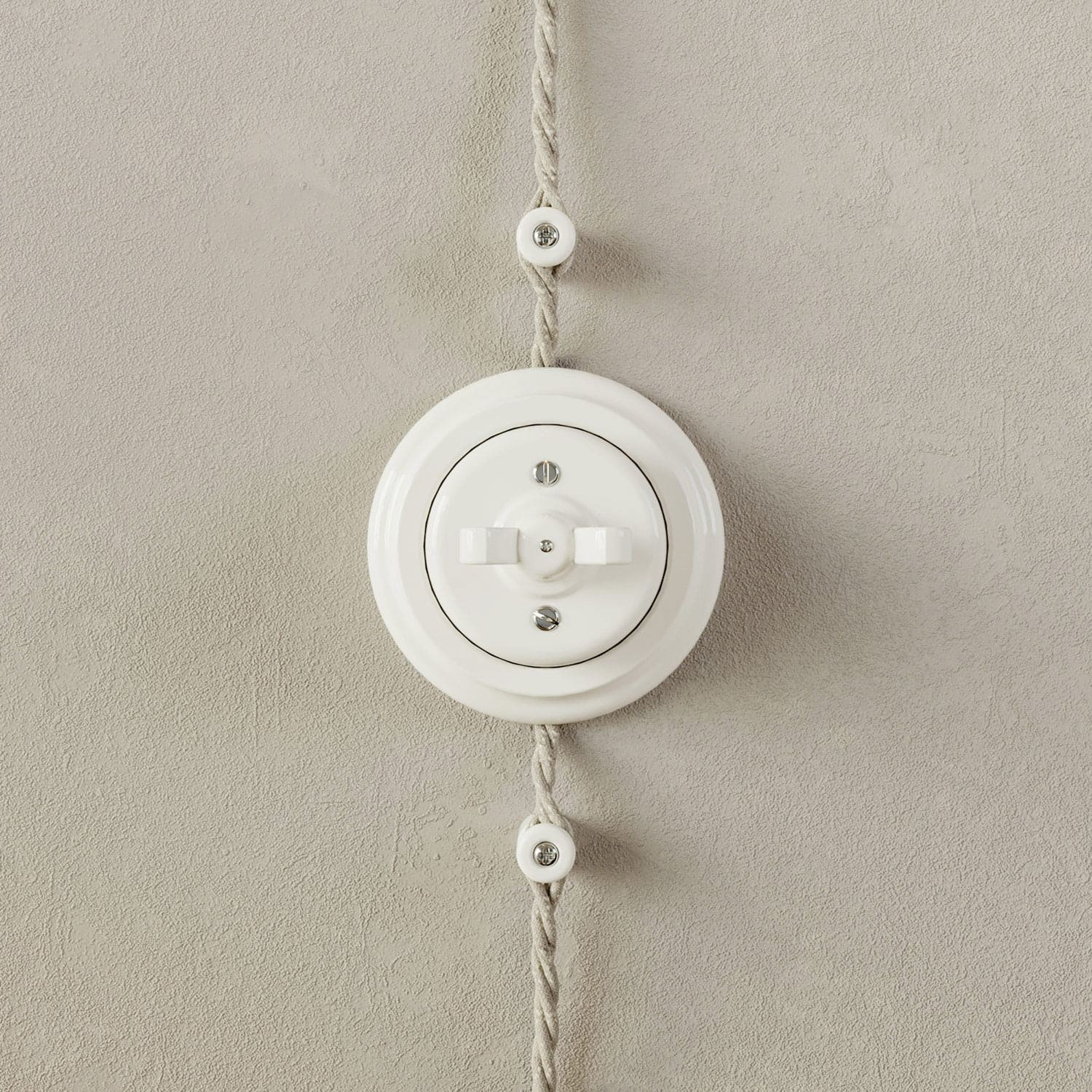 Base in porcellana bianca per interruttori/deviatori e prese adatta per creare impianti elettrici vintage.